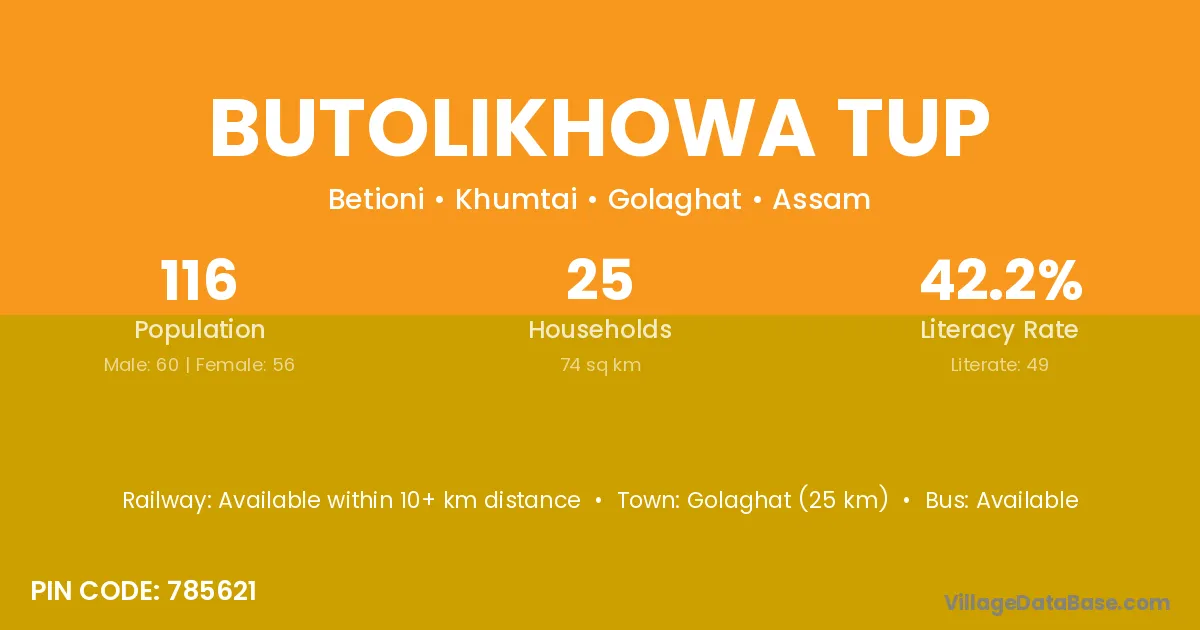 Golaghat (25 km) is the nearest town to Butolikhowa Tup village for major economic activities and is located approximately 25 km away.