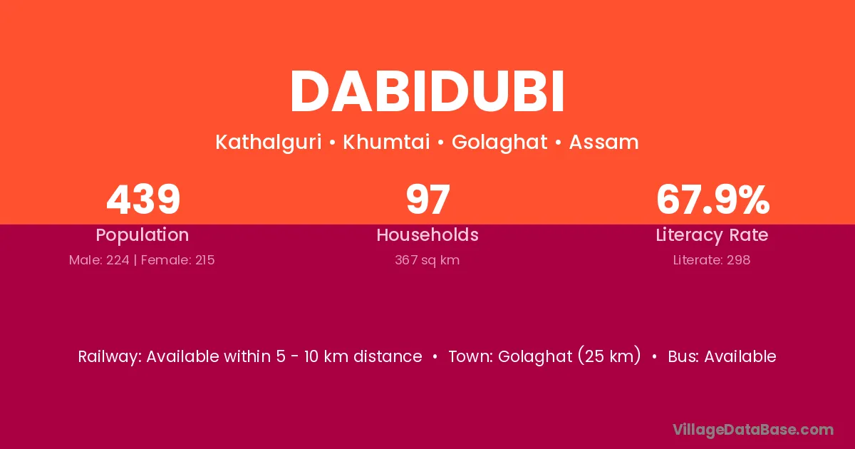Golaghat (25 km) is the nearest town to Dabidubi village for major economic activities and is located approximately 25 km away.