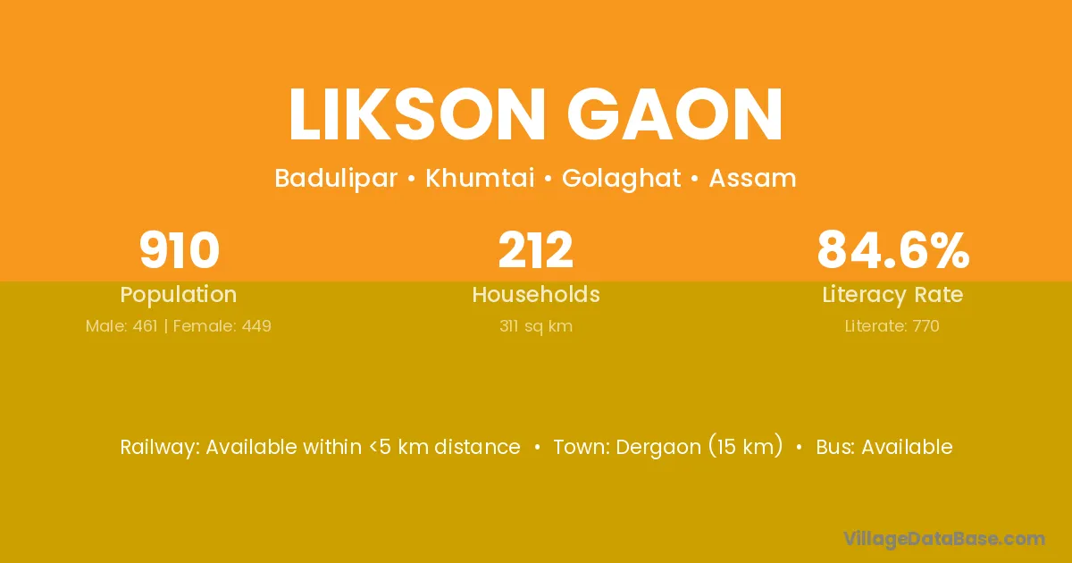 Dergaon (15 km) is the nearest town to Likson Gaon village for major economic activities and is located approximately 15 km away.