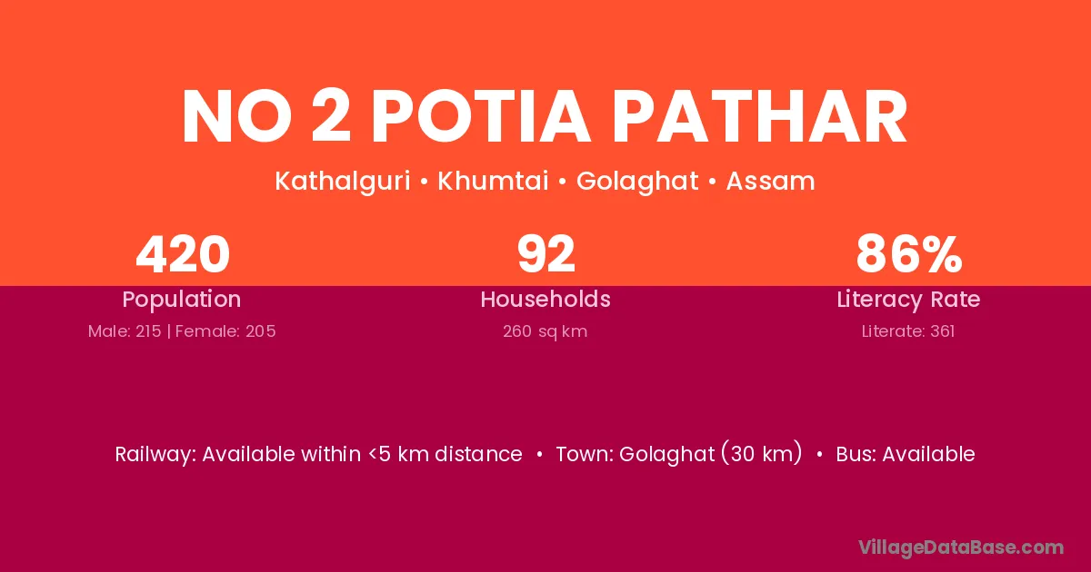 Golaghat (30 km) is the nearest town to No 2 Potia Pathar village for major economic activities and is located approximately 30 km away.