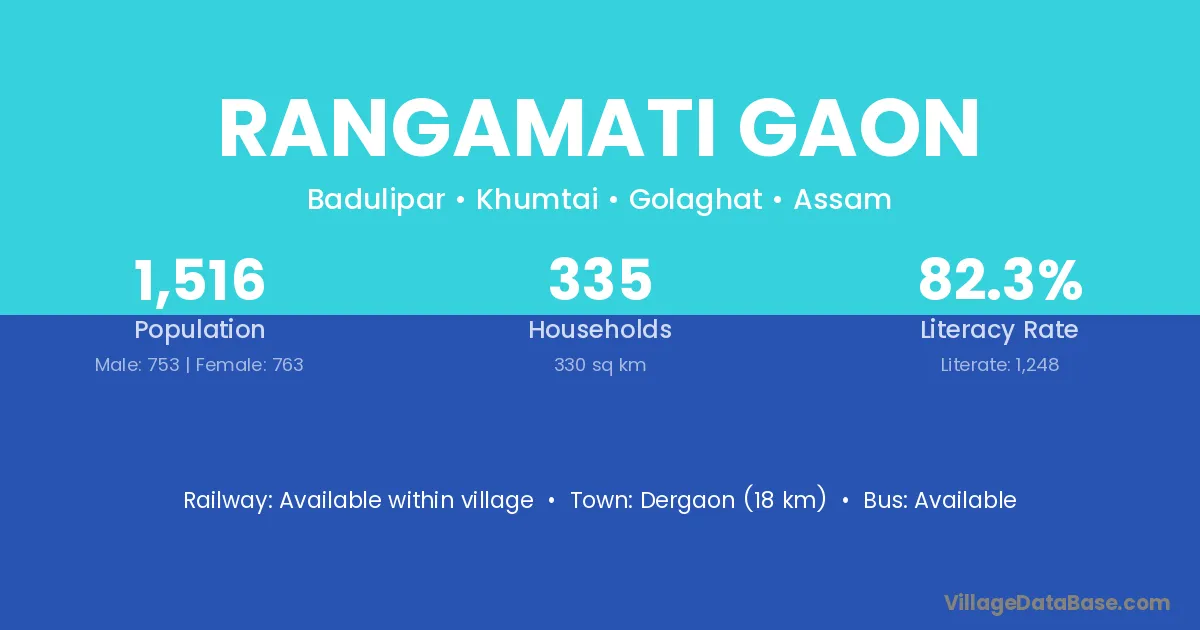 Rangamati Gaon village has a total population of 1,516 people, of which 753 are males and 763 are females.