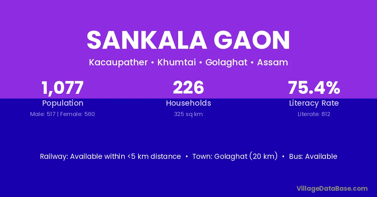 Sankala Gaon village has a total population of 1,077 people, of which 517 are males and 560 are females.