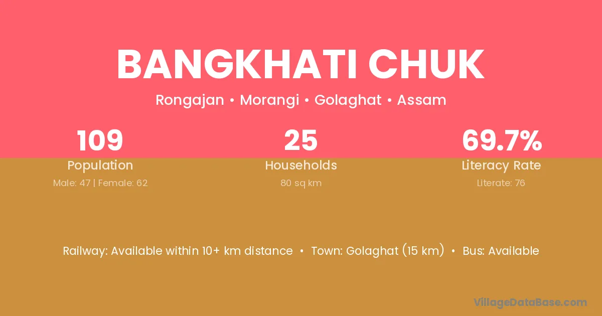 Golaghat (15 km) is the nearest town to Bangkhati Chuk village for major economic activities and is located approximately 15 km away.