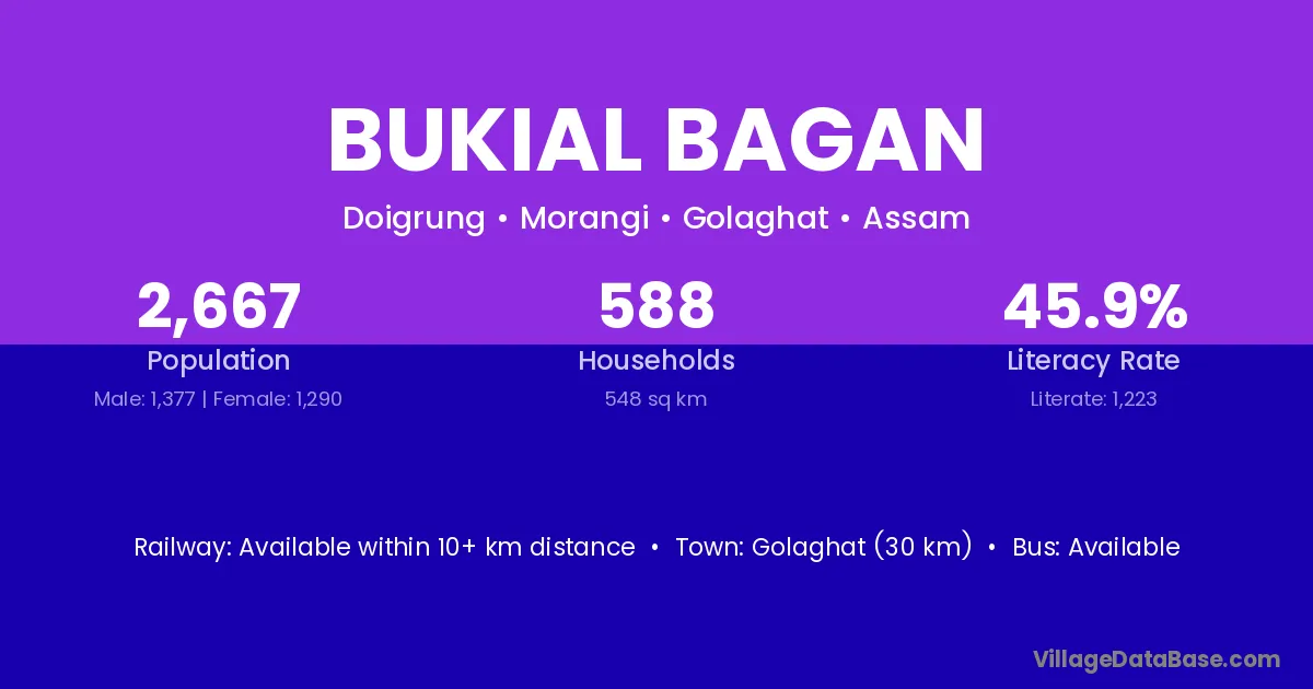 Golaghat (30 km) is the nearest town to Bukial Bagan village for major economic activities and is located approximately 30 km away.