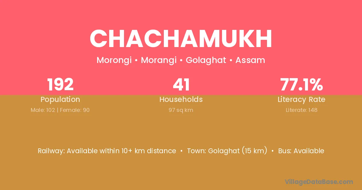 Golaghat (15 km) is the nearest town to Chachamukh village for major economic activities and is located approximately 15 km away.