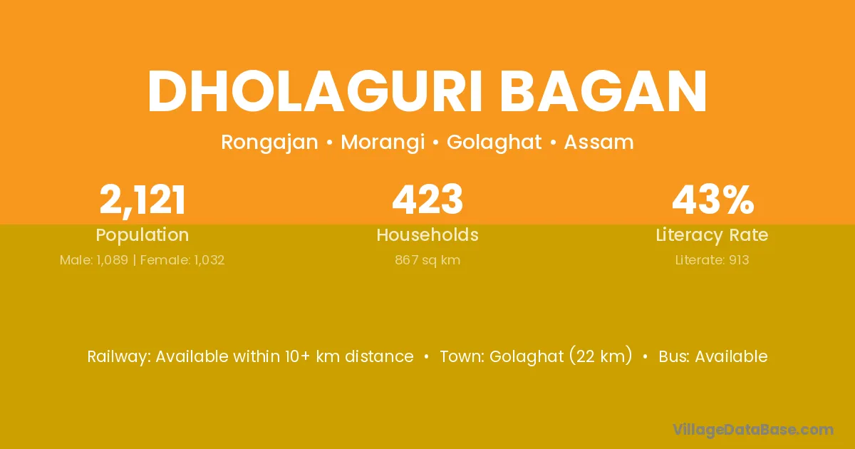 Golaghat (22 km) is the nearest town to Dholaguri Bagan village for major economic activities and is located approximately 22 km away.
