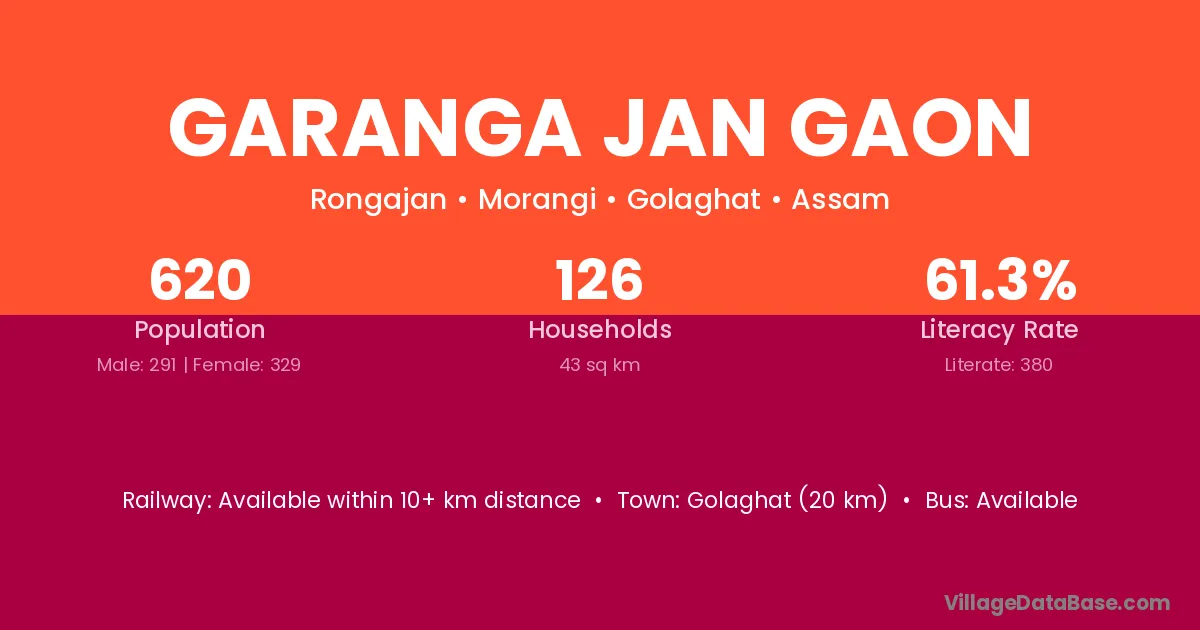 Golaghat (20 km) is the nearest town to Garanga Jan Gaon village for major economic activities and is located approximately 20 km away.