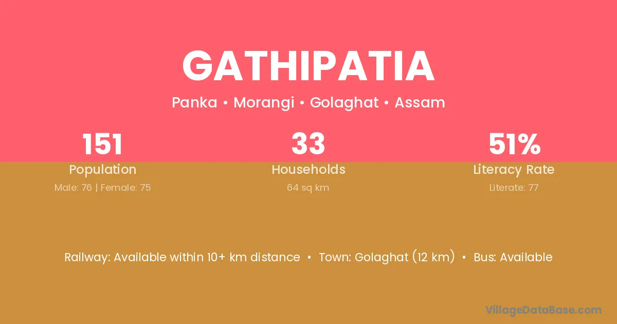Golaghat (12 km) is the nearest town to Gathipatia village for major economic activities and is located approximately 12 km away.