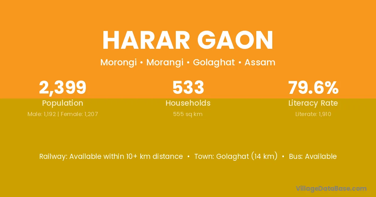 Golaghat (14 km) is the nearest town to Harar Gaon village for major economic activities and is located approximately 14 km away.