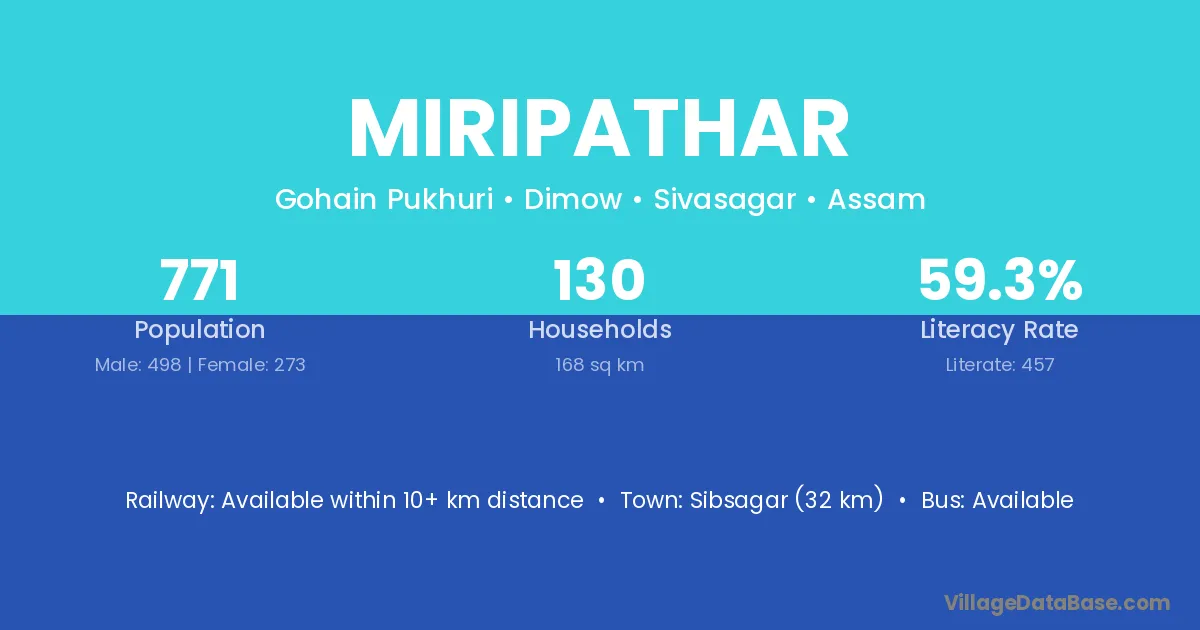 Golaghat (18 km) is the nearest town to Miripathar village for major economic activities and is located approximately 18 km away.