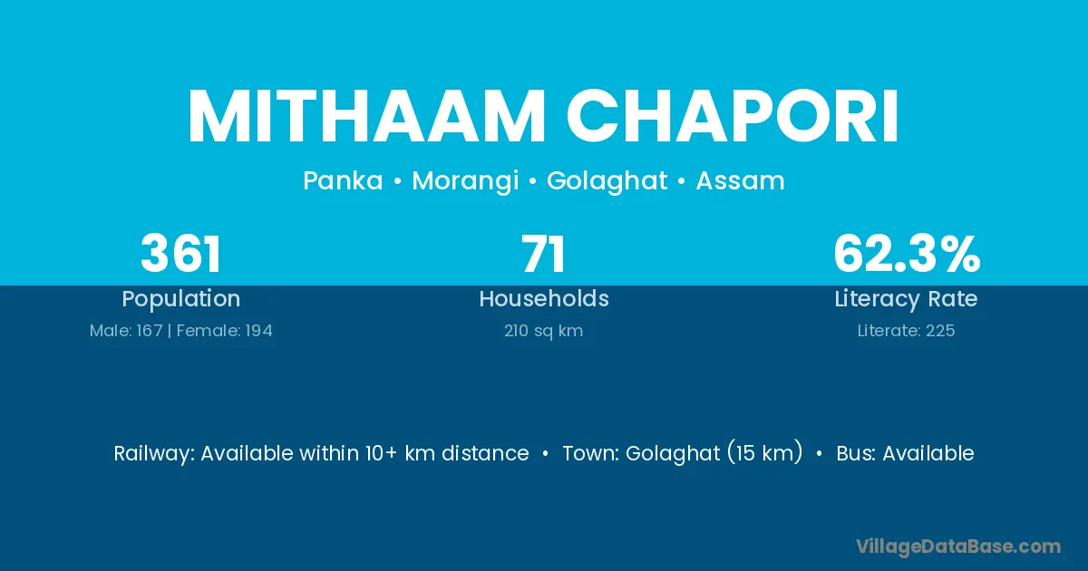 Golaghat (15 km) is the nearest town to Mithaam Chapori village for major economic activities and is located approximately 15 km away.