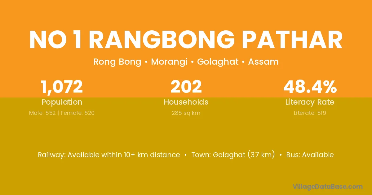 Golaghat (37 km) is the nearest town to No 1 Rangbong Pathar village for major economic activities and is located approximately 37 km away.