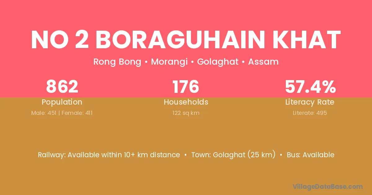 No 2 Boraguhain Khat village has a total population of 862 people, of which 451 are males and 411 are females.