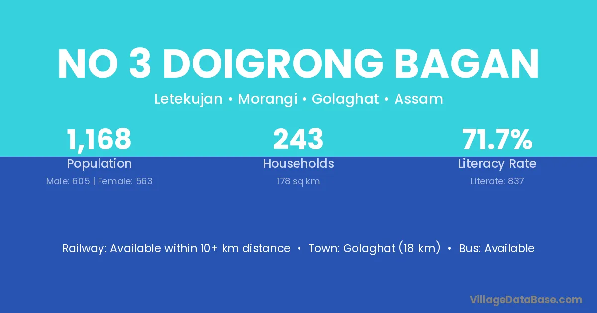 Golaghat (18 km) is the nearest town to No 3 Doigrong Bagan village for major economic activities and is located approximately 18 km away.