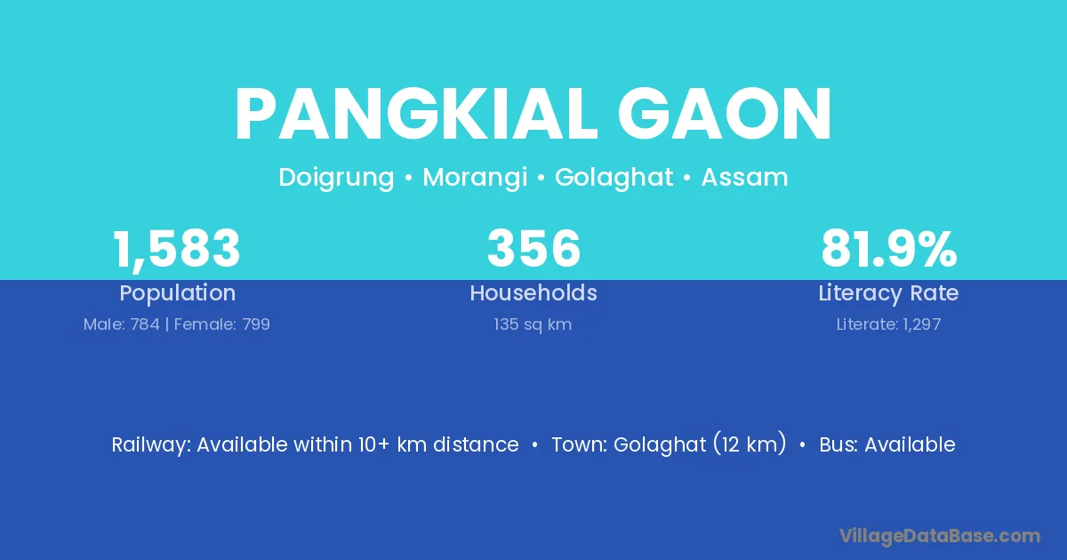 Golaghat (12 km) is the nearest town to Pangkial Gaon village for major economic activities and is located approximately 12 km away.