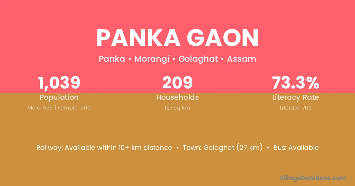 Panka Gaon village has a total population of 1,039 people, of which 539 are males and 500 are females.