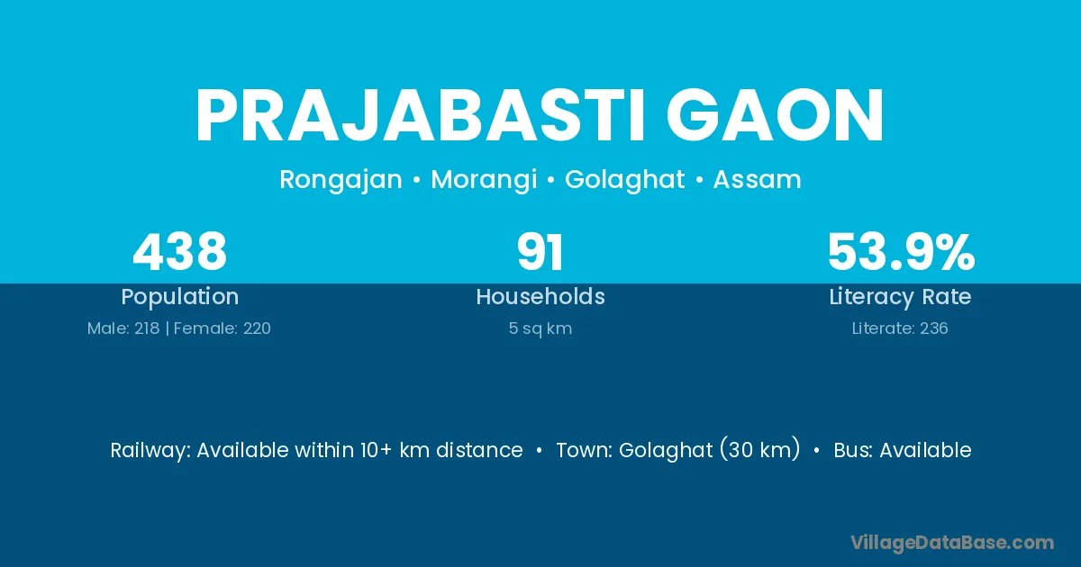 Prajabasti Gaon village has a total population of 438 people, of which 218 are males and 220 are females.