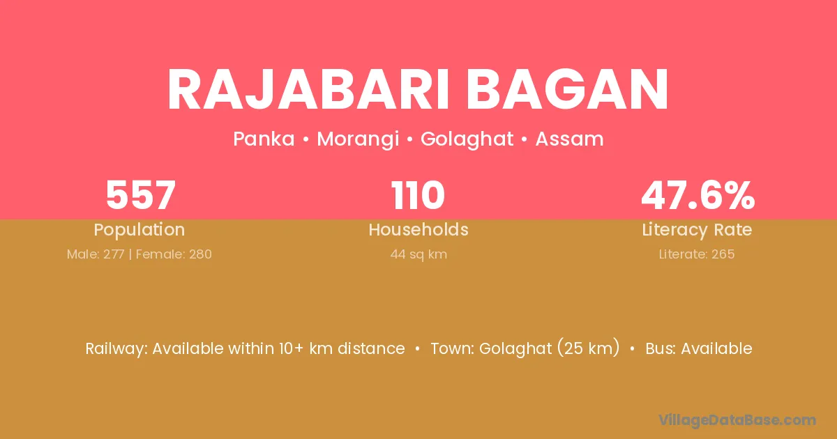 Golaghat (25 km) is the nearest town to Rajabari Bagan village for major economic activities and is located approximately 25 km away.