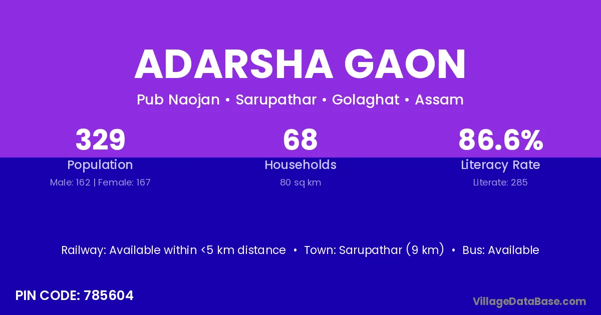 Adarsha Gaon village has a total population of 329 people, of which 162 are males and 167 are females.