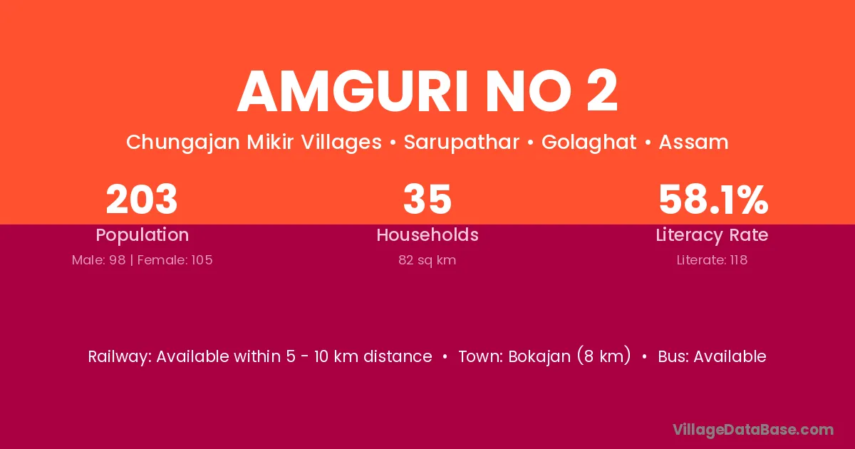Amguri No 2 village has a total population of 203 people, of which 98 are males and 105 are females.