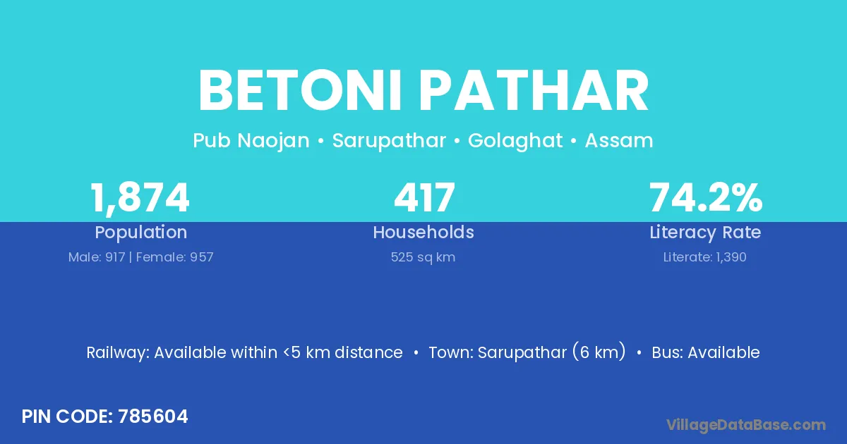 Sarupathar (6 km) is the nearest town to Betoni Pathar village for major economic activities and is located approximately 6 km away.