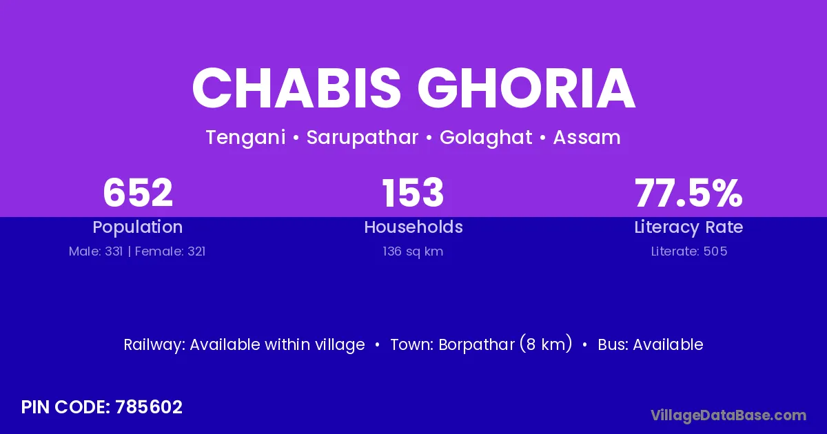 Borpathar (8 km) is the nearest town to Chabis Ghoria village for major economic activities and is located approximately 8 km away.