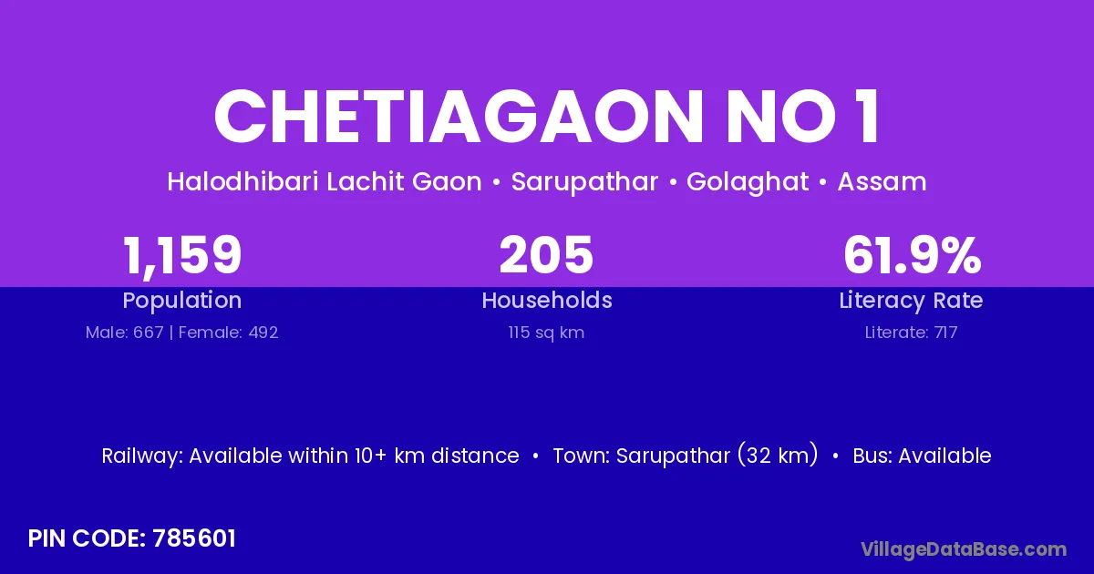 Sarupathar (32 km) is the nearest town to Chetiagaon No 1 village for major economic activities and is located approximately 32 km away.