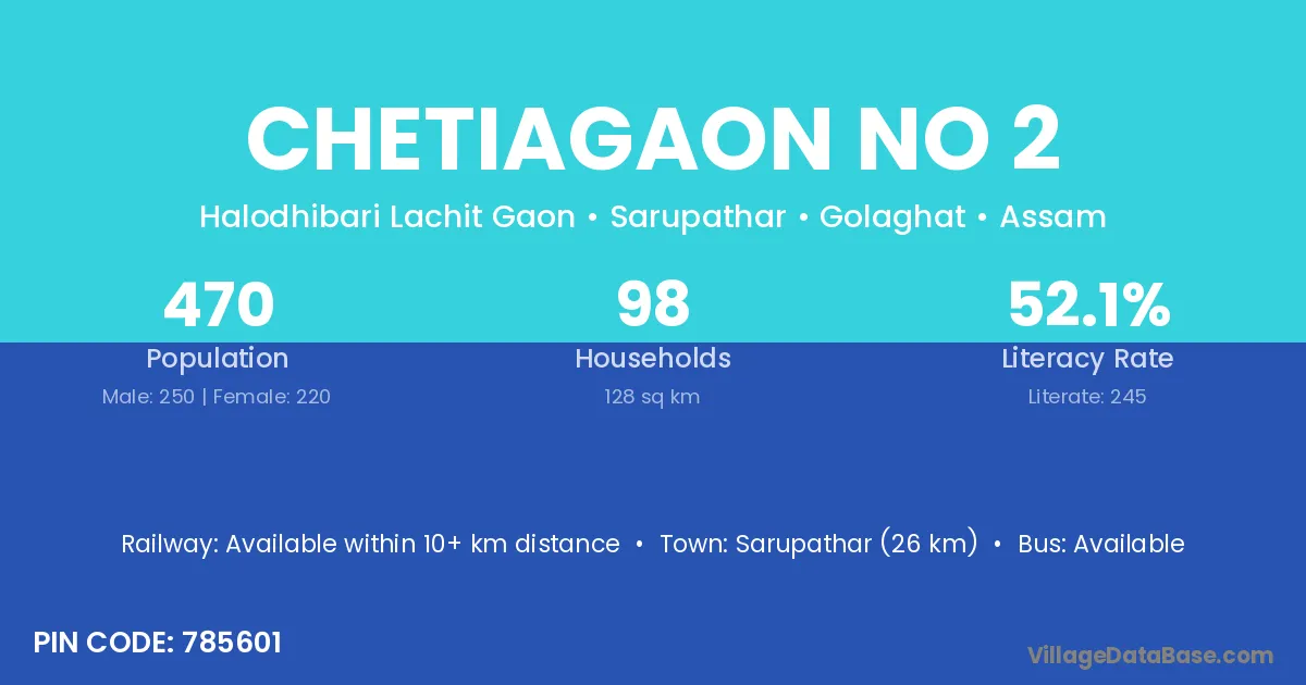Chetiagaon No 2 village has a total population of 470 people, of which 250 are males and 220 are females.