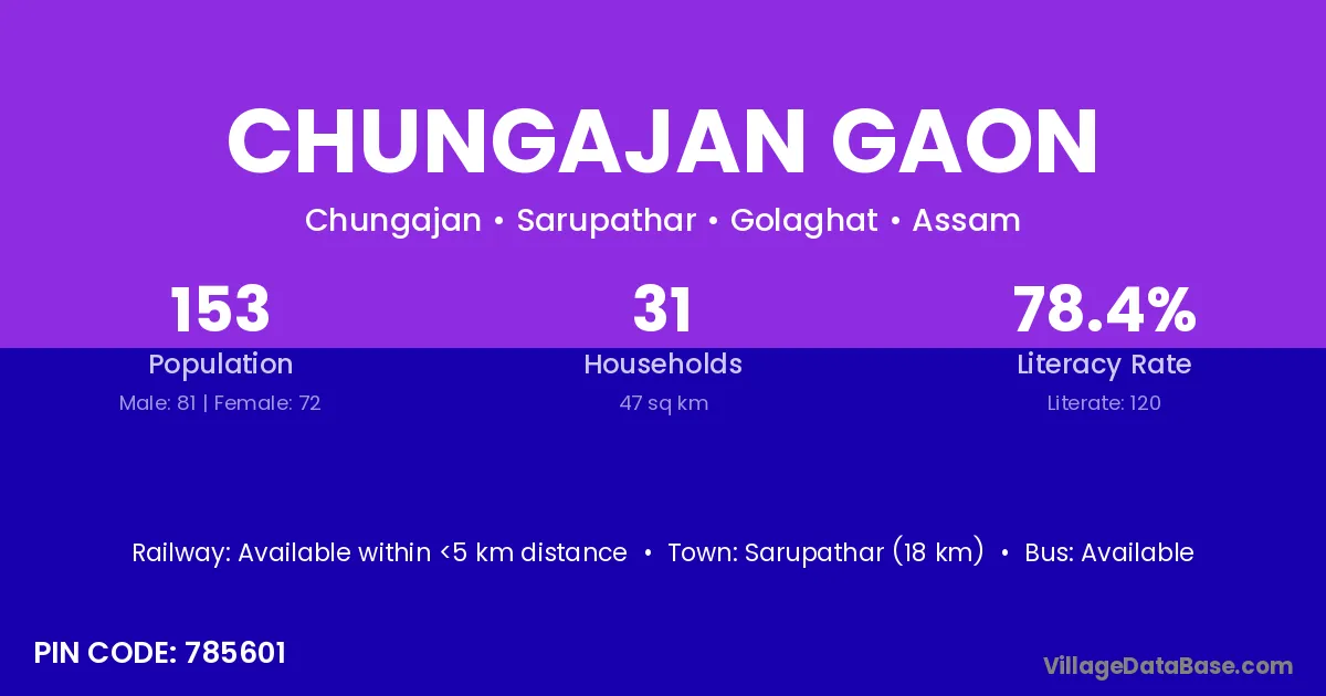 Sarupathar (18 km) is the nearest town to Chungajan Gaon village for major economic activities and is located approximately 18 km away.