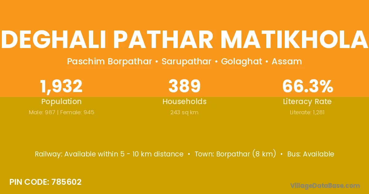 Borpathar (8 km) is the nearest town to Deghali Pathar Matikhola village for major economic activities and is located approximately 8 km away.