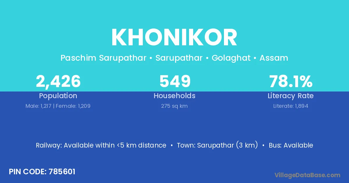 Sarupathar (3 km) is the nearest town to Khonikor village for major economic activities and is located approximately 3 km away.