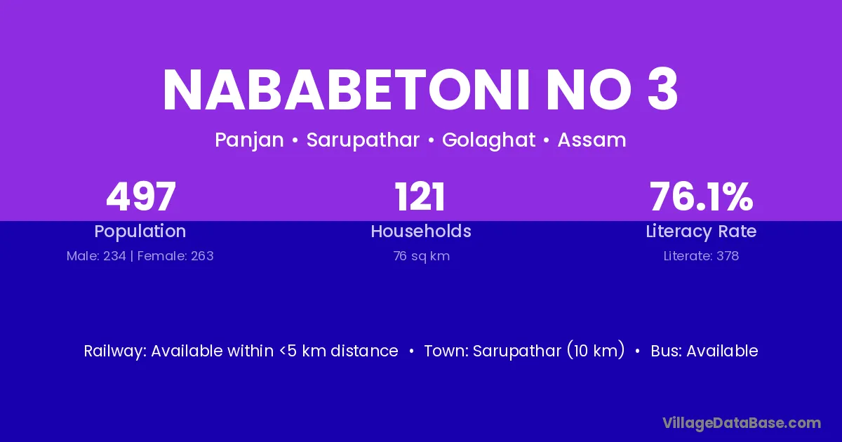 Sarupathar (10 km) is the nearest town to Nababetoni No 3 village for major economic activities and is located approximately 10 km away.