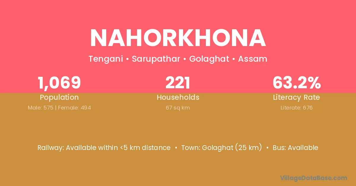 Golaghat (25 km) is the nearest town to Nahorkhona village for major economic activities and is located approximately 25 km away.
