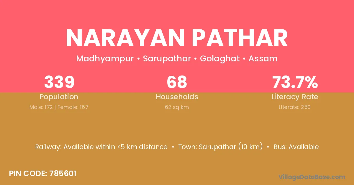 Sarupathar (10 km) is the nearest town to Narayan Pathar village for major economic activities and is located approximately 10 km away.