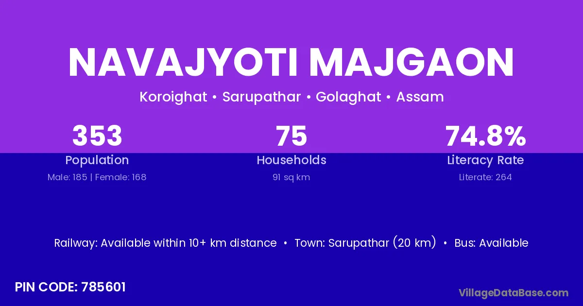 Sarupathar (20 km) is the nearest town to Navajyoti Majgaon village for major economic activities and is located approximately 20 km away.