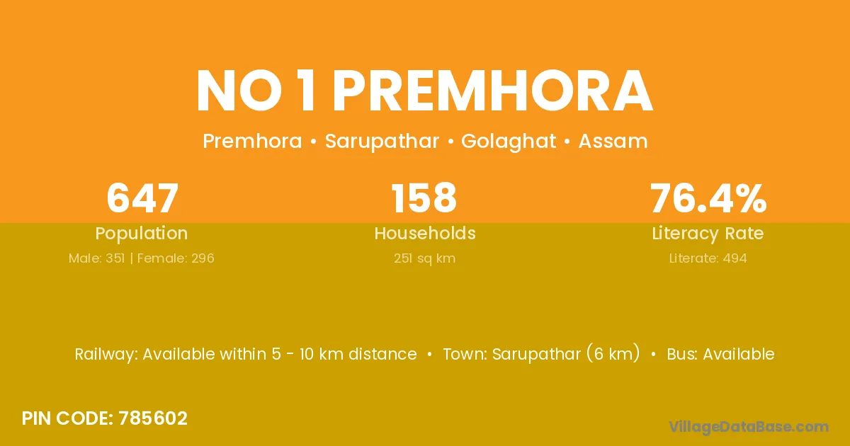 Sarupathar (6 km) is the nearest town to No 1 Premhora village for major economic activities and is located approximately 6 km away.
