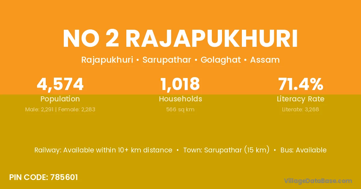 Sarupathar (15 km) is the nearest town to No 2 Rajapukhuri village for major economic activities and is located approximately 15 km away.