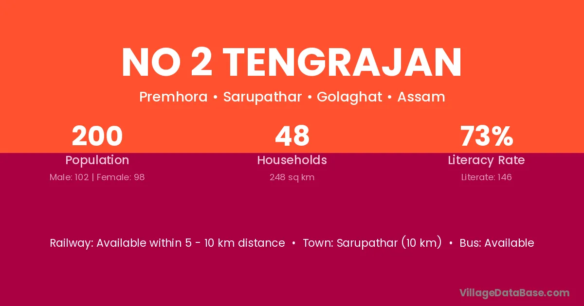 Sarupathar (10 km) is the nearest town to No 2 Tengrajan village for major economic activities and is located approximately 10 km away.