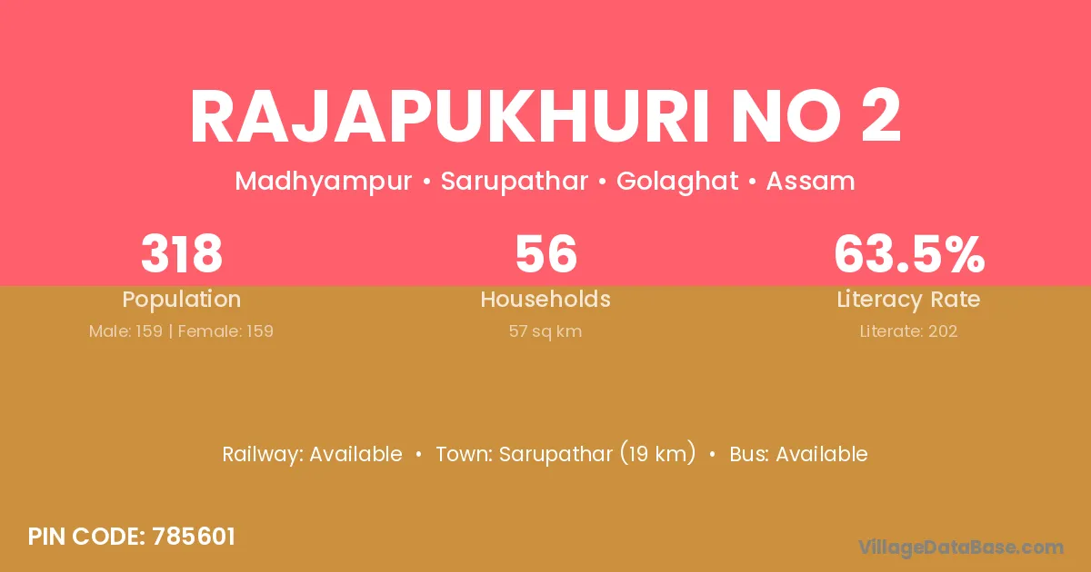 Rajapukhuri No 2 village has a total population of 318 people, of which 159 are males and 159 are females.