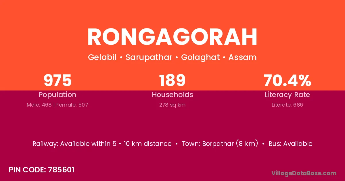 Borpathar (8 km) is the nearest town to Rongagorah village for major economic activities and is located approximately 8 km away.