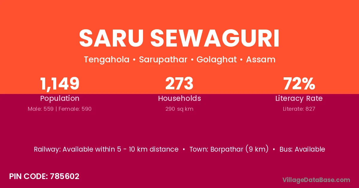 Borpathar (9 km) is the nearest town to Saru Sewaguri village for major economic activities and is located approximately 9 km away.