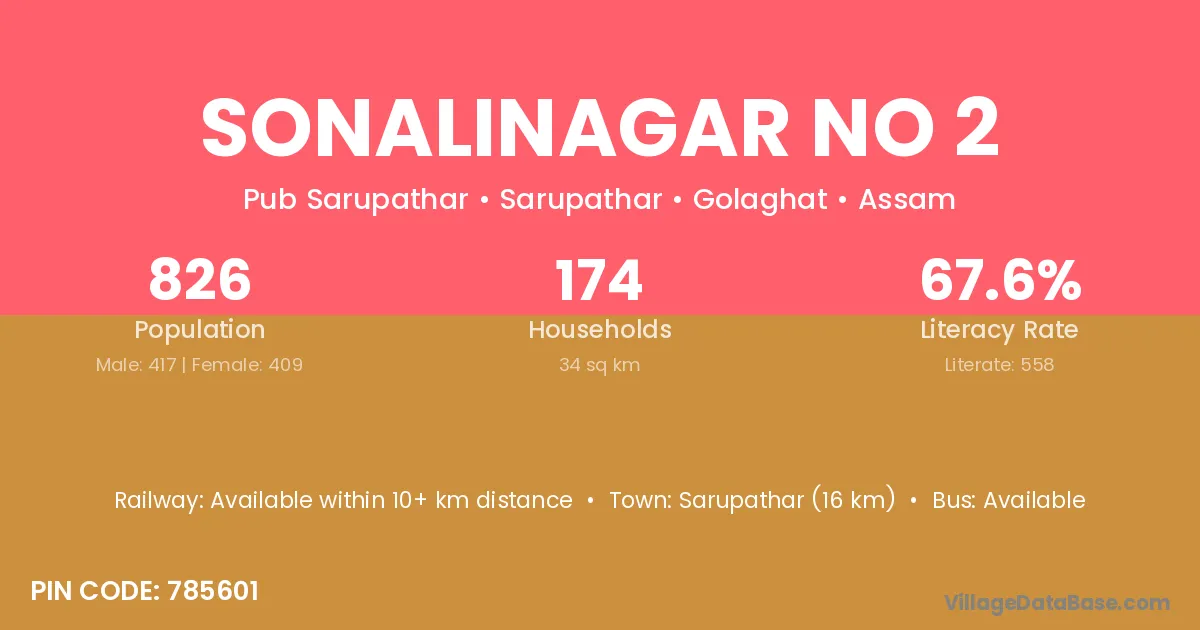 Sonalinagar No 2 village has a total population of 826 people, of which 417 are males and 409 are females.