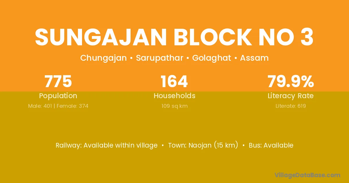 Sungajan Block No 3 village has a total population of 775 people, of which 401 are males and 374 are females.
