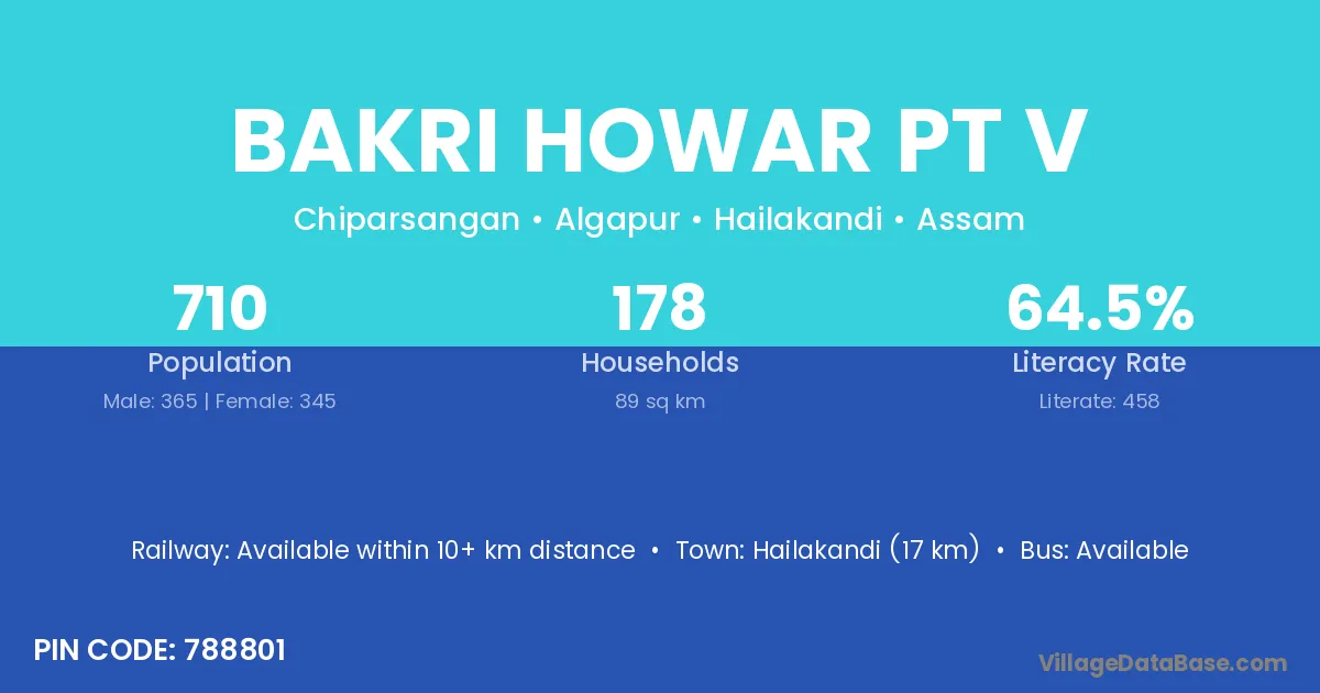 Hailakandi (17 km) is the nearest town to Bakri Howar Pt V village for major economic activities and is located approximately 17 km away.