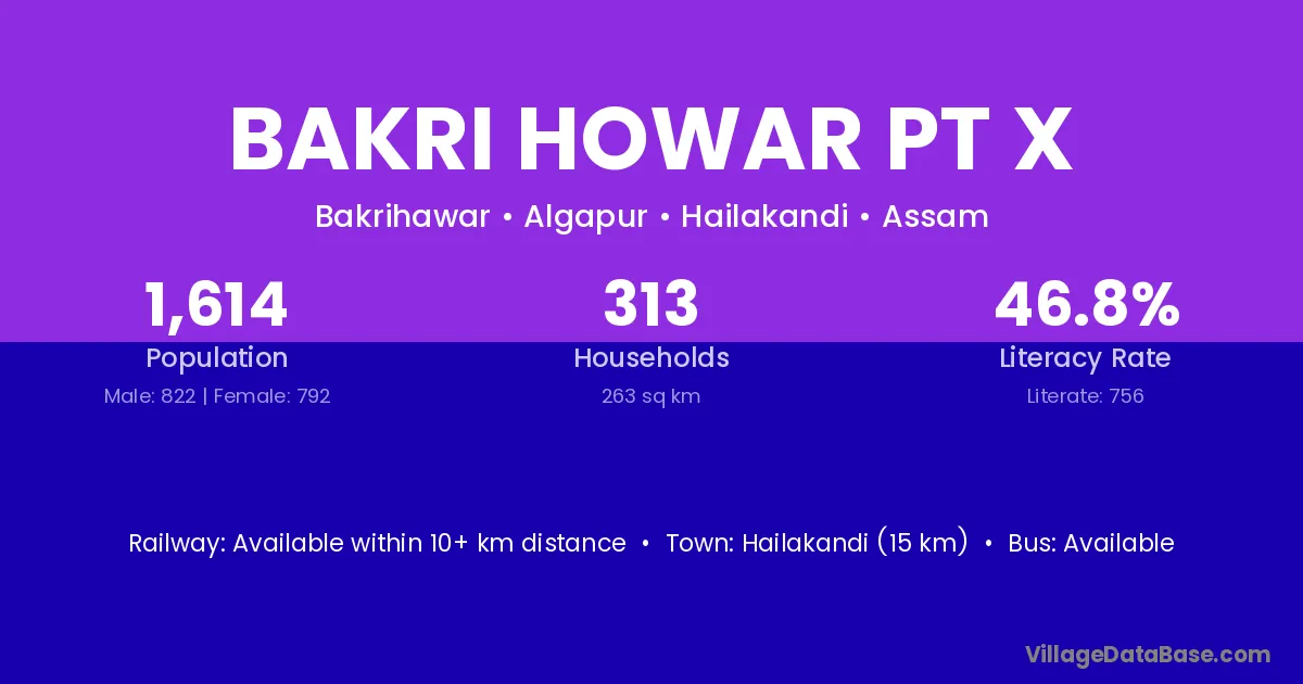 Hailakandi (15 km) is the nearest town to Bakri Howar Pt X village for major economic activities and is located approximately 15 km away.