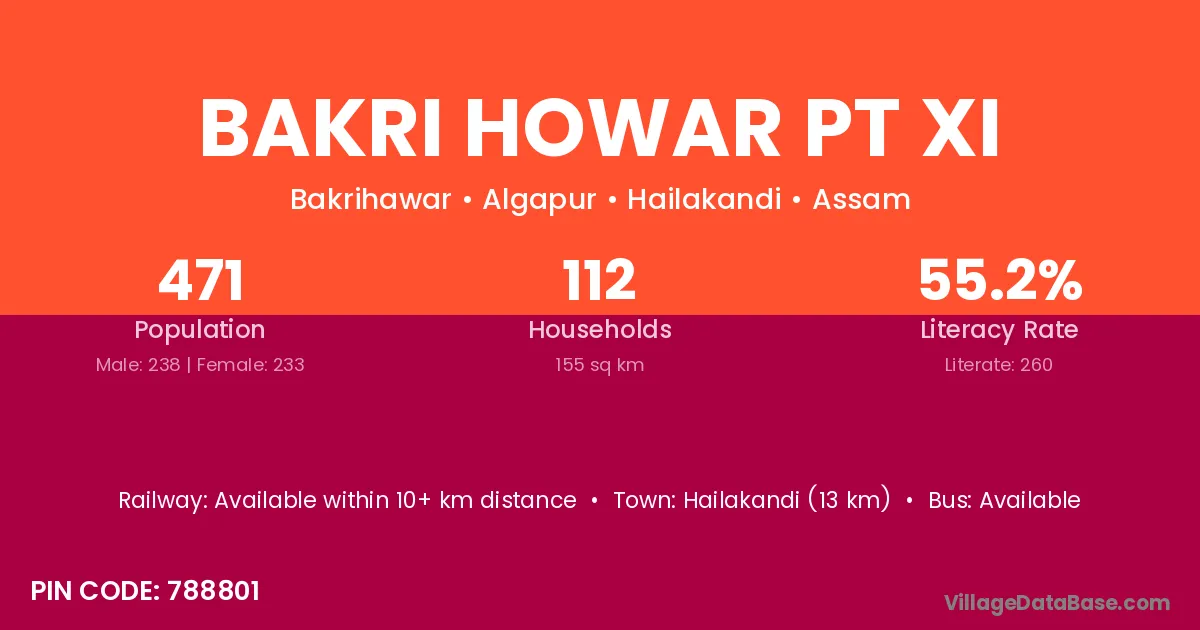 Hailakandi (13 km) is the nearest town to Bakri Howar Pt Xi village for major economic activities and is located approximately 13 km away.