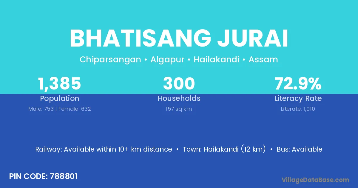 Hailakandi (12 km) is the nearest town to Bhatisang Jurai village for major economic activities and is located approximately 12 km away.