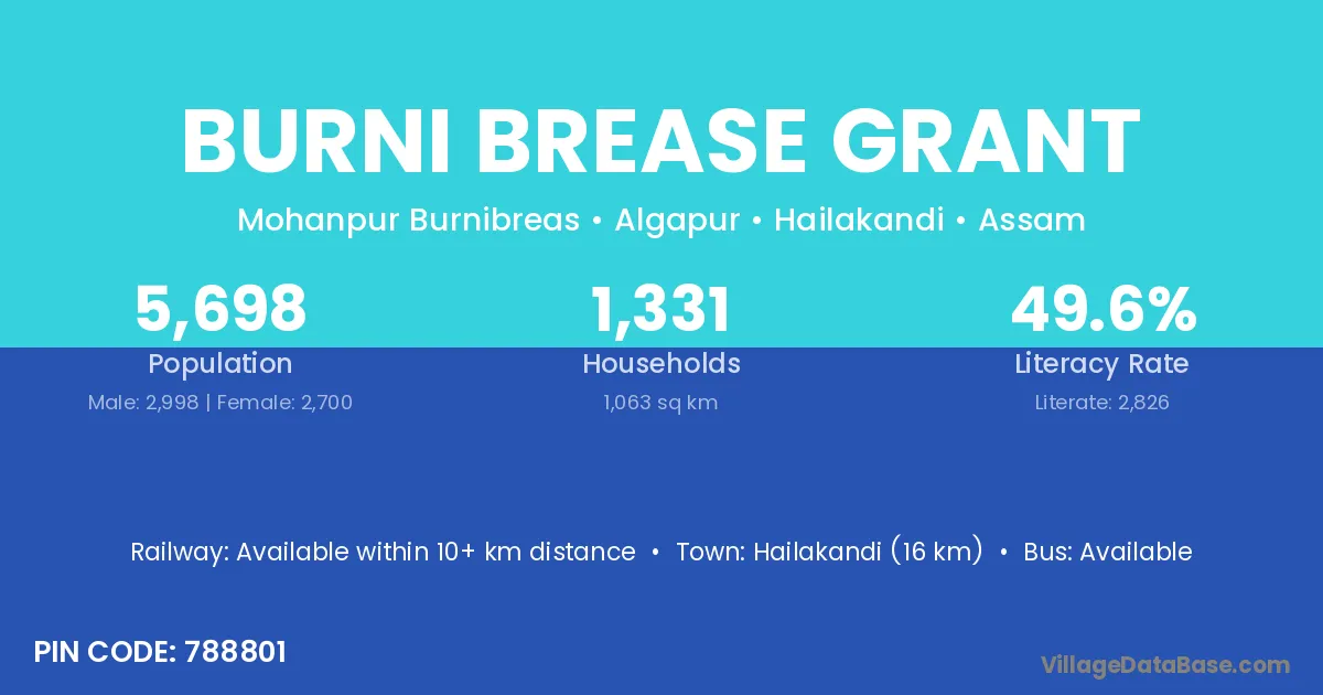 Hailakandi (16 km) is the nearest town to Burni Brease Grant village for major economic activities and is located approximately 16 km away.