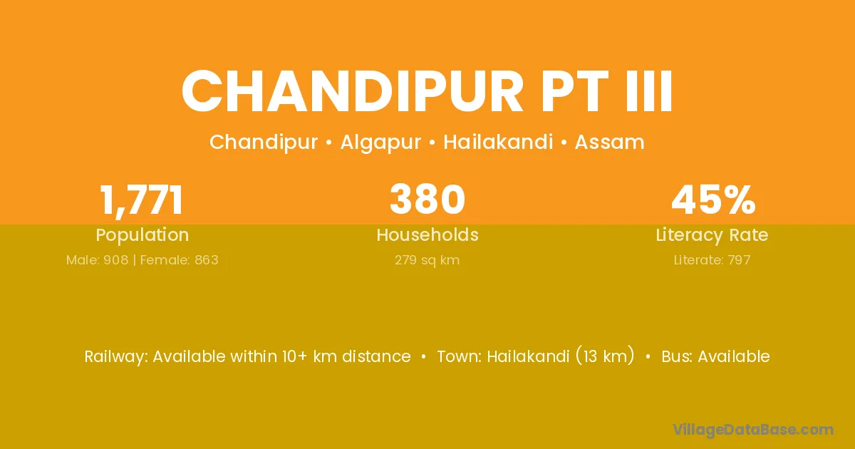 Hailakandi (13 km) is the nearest town to Chandipur Pt Iii village for major economic activities and is located approximately 13 km away.
