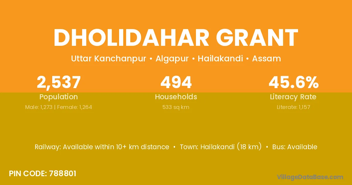 Hailakandi (18 km) is the nearest town to Dholidahar Grant village for major economic activities and is located approximately 18 km away.